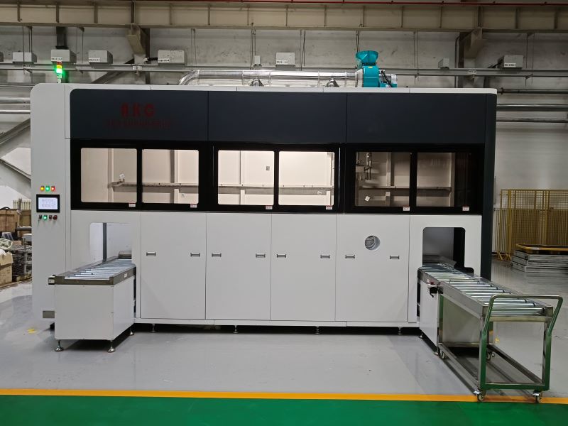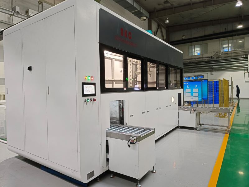 本设备为四槽全自动超声波清洗机,采用全自动封闭式结构,由清洗槽、储液槽、循环过滤系统、加热系统、温度控制系统、液位控制系统、抛动机构、热风及真空干燥系统、机械臂、油水分离器、电气系统、排风排水系统等等组成。具备粗洗、精洗、漂洗、干燥功能,自动化程度高,降低人工劳动强度,方便维护保养。在上料端操作者将装有工件的清洗篮放置在上料轨道上,上料轨道自动将清洗篮输送至机勾篮位,当传感器感应清洗篮到位后,机械臂下降提取清洗篮,按设定好的程序依次将清洗篮送往各功能槽中对工件进行清洗,当清洗时间到达后,机械臂下降提取清洗篮框横移至下一个工序进行清洗或干燥,逐步经过超声波清洗槽、超声波漂洗槽、超声波防锈漂洗槽、真空干燥槽,设备感应到出料位有运料车后再将清洗篮横移到出料轨道上,出料完成。
